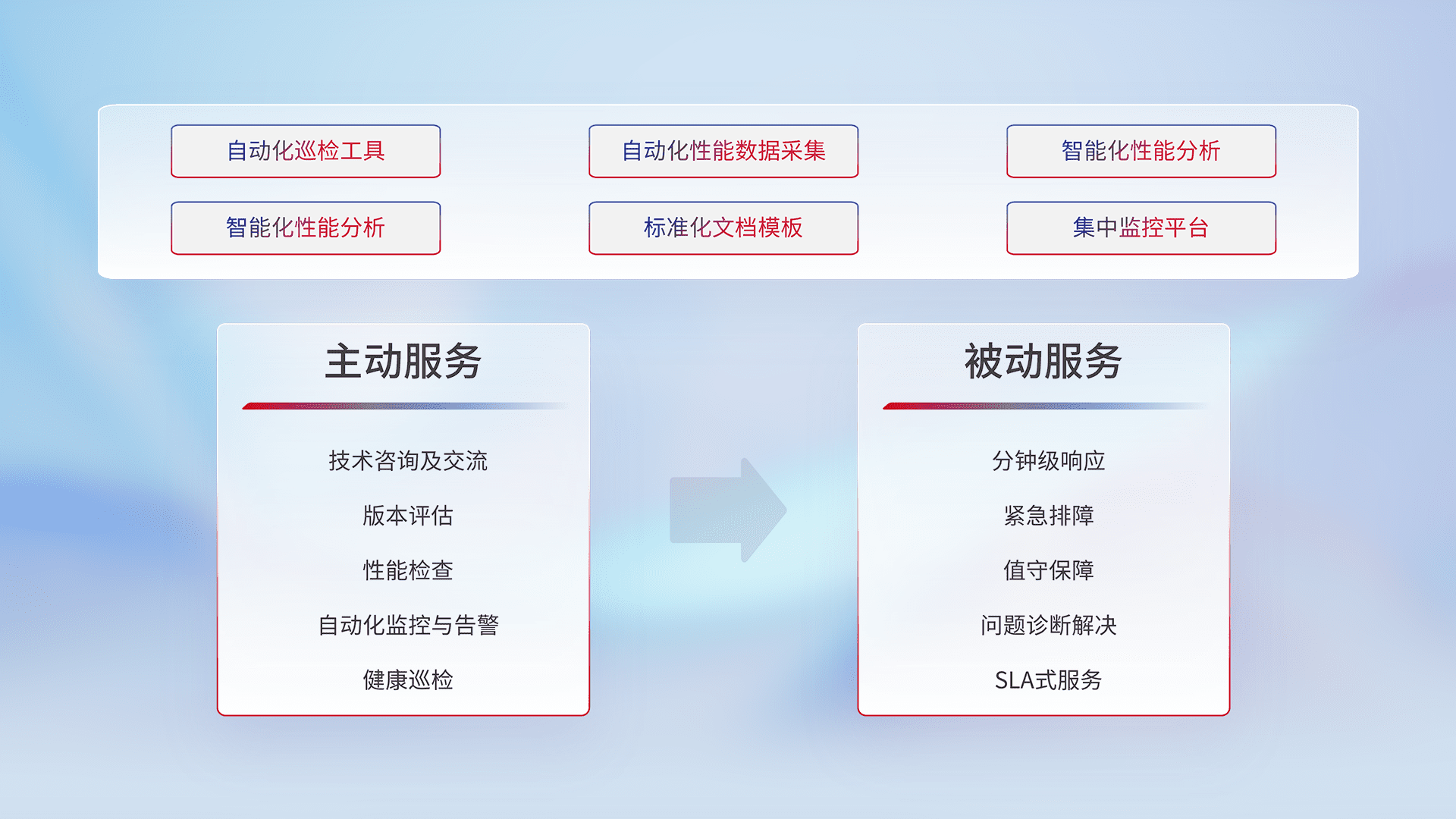 智能化工具和标准化文档,,,,保障服务质量,,提供主动服务(包含技术咨询、、、、版本评估、、、、性能检查、、自动化监控与告警、、、、健康巡检)和被动服务包含(分钟级响应、、、紧急排障、、、、值守保障、、问题诊断解决、、SLA服务)。。