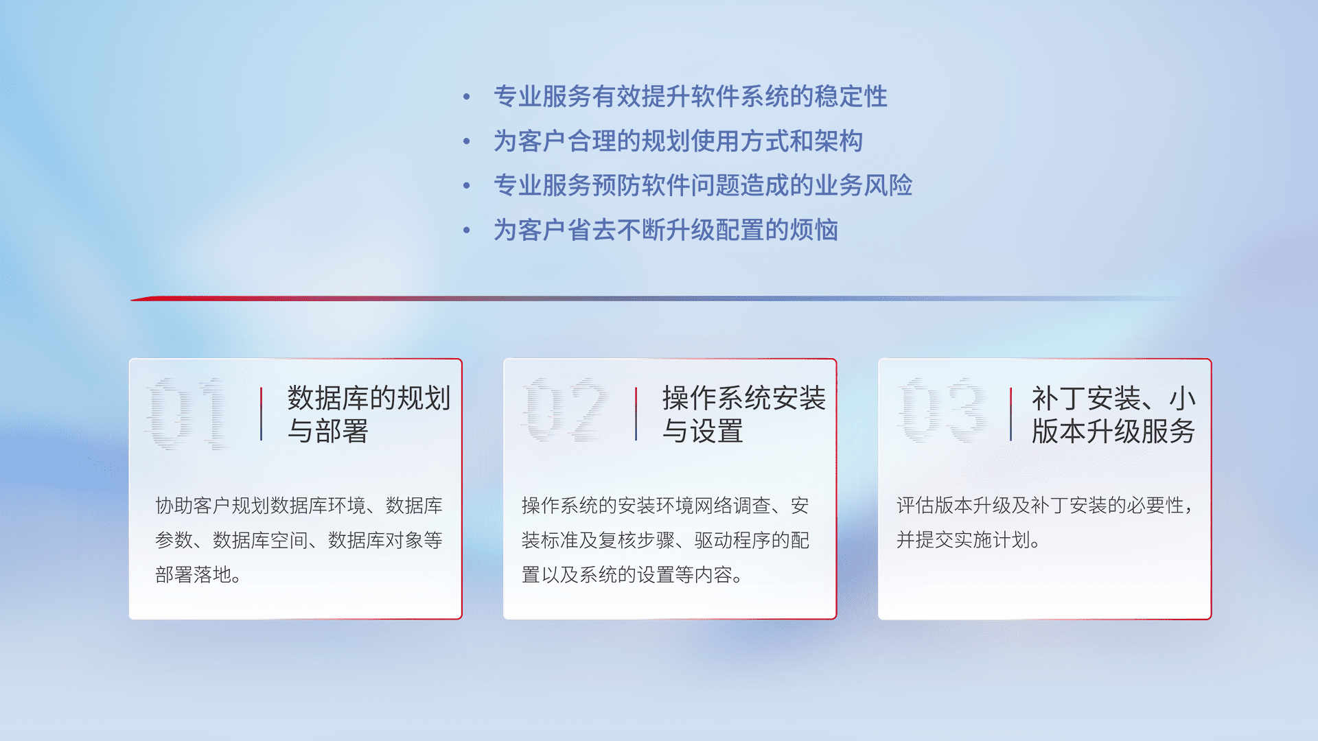 为客户提供软件规模升级、、、快速部署、、按需配置的专业服务,,,,从数据库的规划与部署到操作系统的安装与设置,,,,再到补丁安装和小版本升级提供支持。。。。